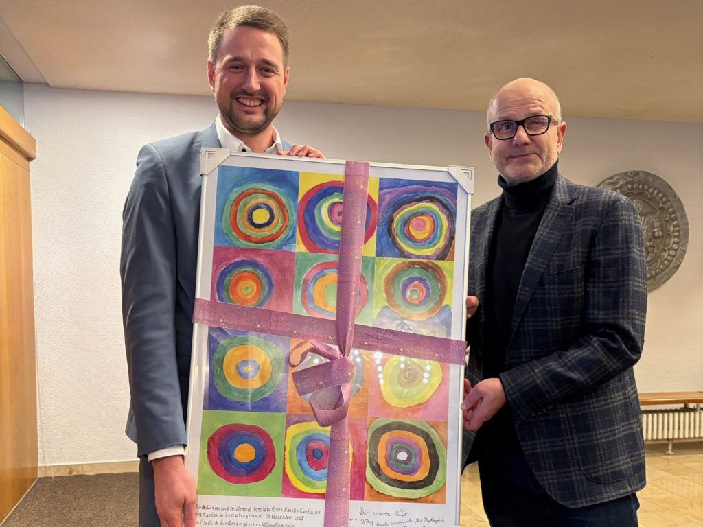 Heimleiter und Geschäftsführer Markus Komp überreicht Bürgermeister Patrick Haas beim traditionellen Neujahrsempfang der Stadt Hüfingen am 18.01.2026 ein Geschenk aus unserem „Gestaltungsraum”.