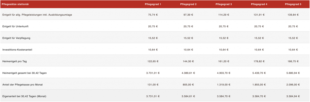 | Heimentgelt pro Tag | 122,65 € | 144,30 € | 161,20 € | 178,82 € | 186,75 € |